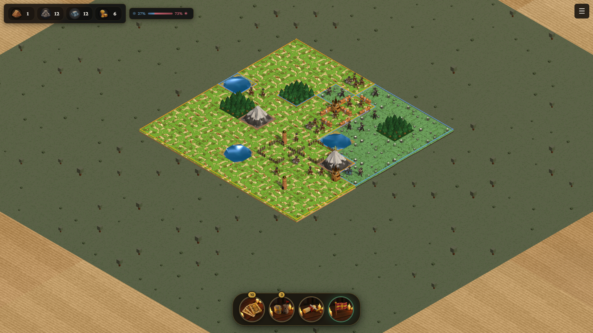 Зіграй карти з колоди — отримай деревину, камінь, залізо та їжу. Без ресурсів армія не росте.